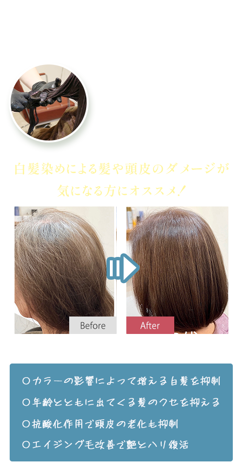 染めるたびにしっとりとした手触りが増し、白髪が目立ちにくく色持ちも長く続くとご好評をいただいております。